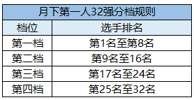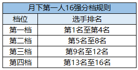 (3)在32強比賽結束后,進入月下第一人每個門派的16強少俠將根據復賽成績進行排名,排名后將分為4檔,分檔規則如下: