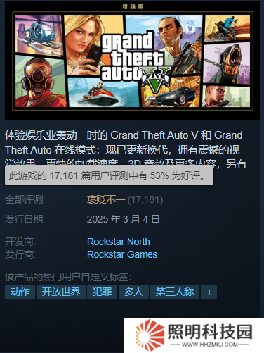 目前在Steam平臺,《GTA5》PC次世代版本(官方名稱《GTA5 增強版》),僅僅只有53%的好評率,為系列最低。這項數據,甚至不如此前外包團隊開發的《GTA三部曲》。