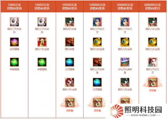 普通版玩家有機會贏得八階坐騎靈牙象、隨**階或九階坐騎(僅至尊系列)、隨機元靈、點化羽化滿的神獸、隨機變異等獎勵。