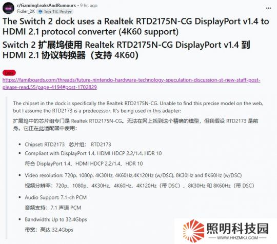 Famiiboards論壇用戶Serif今日披露了關于主機底座搭載的Realtek RTD2175N-CG芯片組的關鍵信息。雖然該具體型號缺少相關的的公開資料,但與其最接近的RTDN2173芯片組(推測是Switch2底座芯片的前代產品)已支持DisplayPort 1.4、HDMI HDCP 2.2/1.4、HDR,以及720p至8K60Hz的視頻輸出。