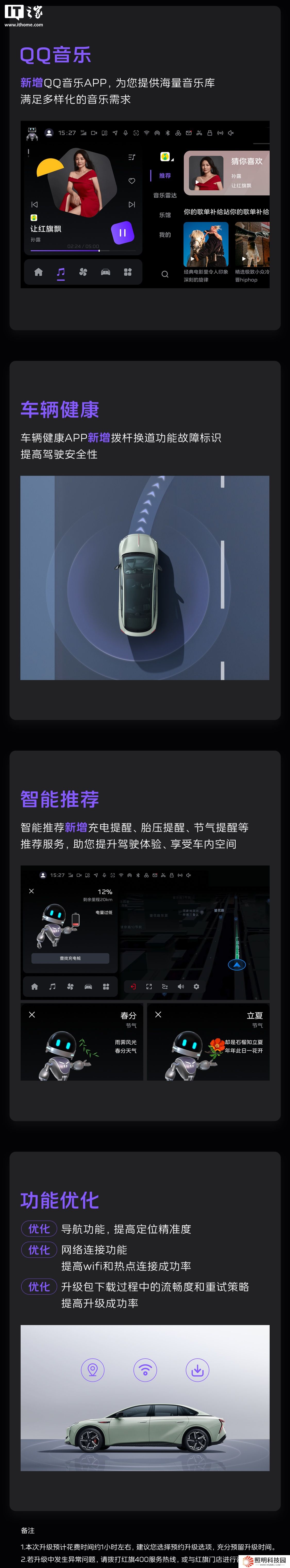 本站 4 月 7 日消息,一汽紅旗 EH7 汽車今日官宣獲OTA 升級(具體版本未公布),宣稱“舒適娛樂 6 項功能全面優化”,新增支持充電、胎壓、節氣提醒等推薦服務。