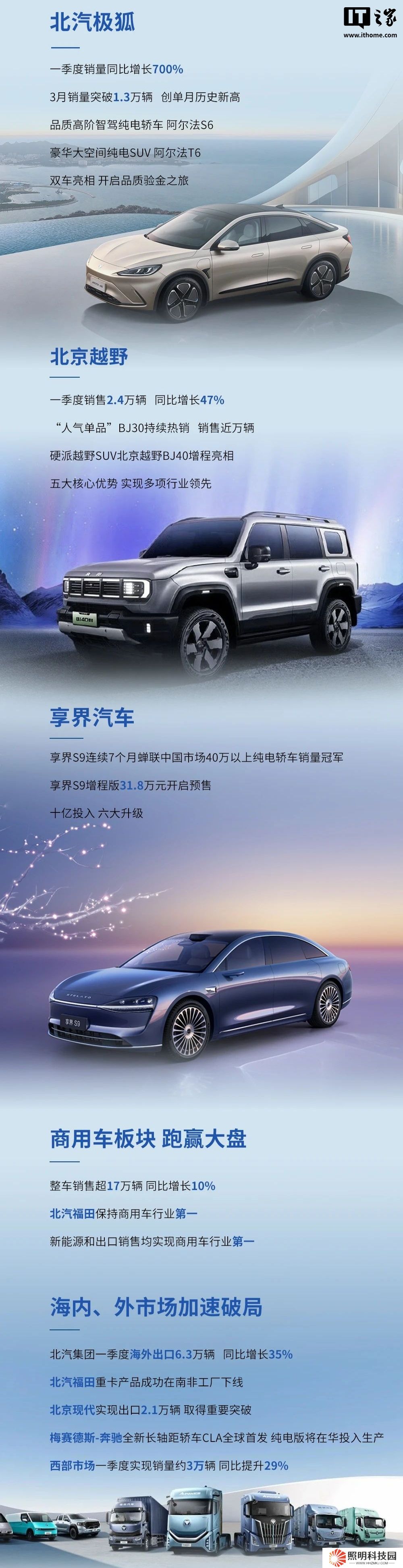本站查詢獲悉,北汽極狐 3 月銷量超 1.3 萬輛,創(chuàng)單月歷史新高,同時一季度銷量同比增長 700%;北京越野一季度銷售 2.4 萬輛,同比增長 47%,其中 BJ30 車型銷售近萬輛;享界 S9 連續(xù) 7 個月蟬聯(lián)中國市場 40 萬以上純電轎車銷量冠軍;商用車板塊整車銷售超 17 萬輛,同比增長 10%,北汽福田保持商用車行業(yè)第一,新能源和出口銷售均實現(xiàn)商用車行業(yè)第一。