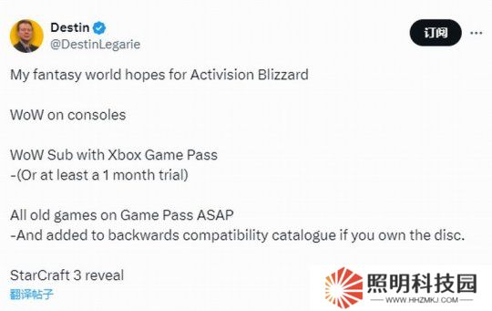 隨后Destin闡述了他對動視暴雪的期待,包括在主機端推出《魔獸世界》,將《魔獸世界》訂閱與XGP綁定,或至少提供一個月的試用。盡快讓所有老游戲登陸XGP,并支持光盤版游戲向下兼容。開發并發布《星際爭霸3》。