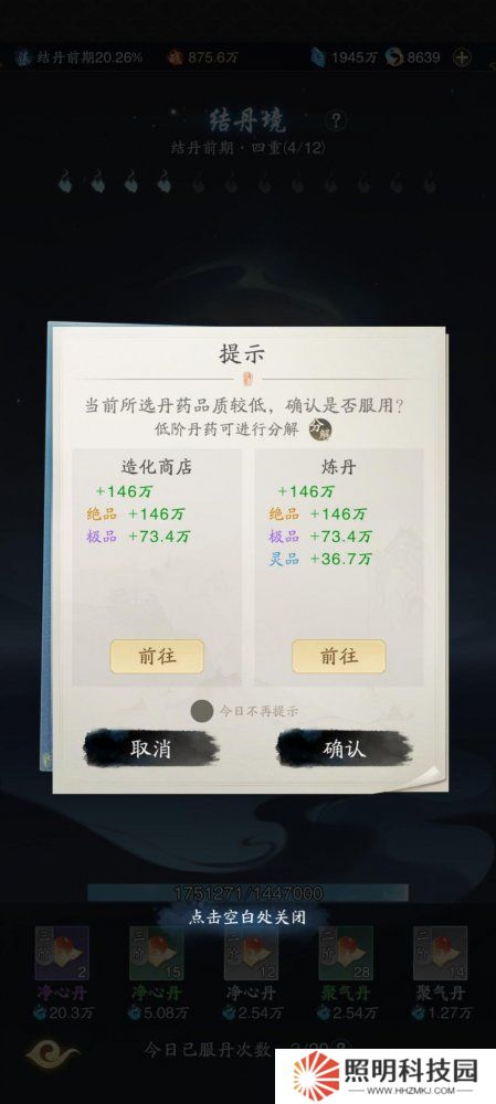 此外,丹藥也不是無腦亂吃的,每天服用丹藥的次數有限制,所以為了最大化提升修為,引氣境——聚氣丹、筑基境——凈心丹、結丹境——續脈丹,要服用當前等階最高的丹藥,另外通脈丹、凝神丹、引氣丹也是如此,品階越高提升的成功率越高,可以避免突破失敗浪費時間。
