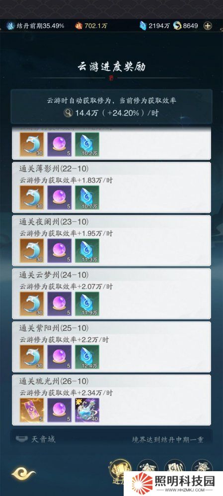 第一就是刷圖,《踏風行》是一款修仙放置游戲,云游時即可自動獲取修為,以及各種修仙資源,而地圖推進越深,云游獲取獎勵就越高,比如我們通關洛風州時,云游獲得修為的效率是每小時600點,而通關流火州時,修為獲得的效率高達每小時2760點!