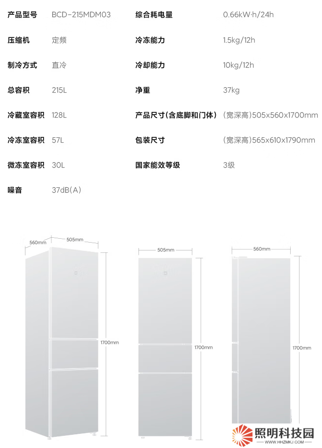 本站從商品頁面獲悉,這款新品約 0.28m3 占地面積、505mm 最大寬度,容積率達 44.8%。新品有 215L 容量,其中冷藏保鮮 128L,中門微凍 30L,冷凍保存 57L。