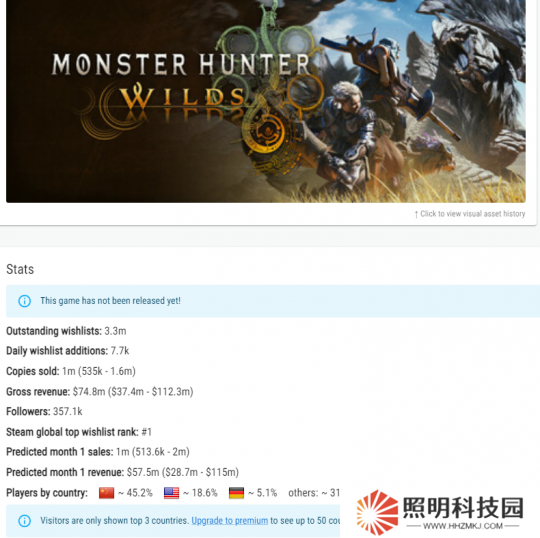 現在據Gamalytic網站數據顯示,目前《怪物獵人:荒野》在Steam上的預估預售量已達到100萬份,總收入為7480萬美元(約合人民幣5.42億元)。國區占比達到45.2%,美國地區占比18.6%。