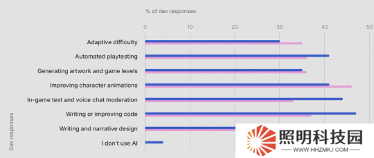 根據(jù)調(diào)查,即便接受度日益增高,整個(gè)行業(yè)的 AI 使用率依然比較穩(wěn)定。實(shí)際上 AI 的部分使用,例如在“自適應(yīng)難度”方面的使用有所下降。不過(guò)在其他領(lǐng)域,例如游戲測(cè)試方面則略有增加。