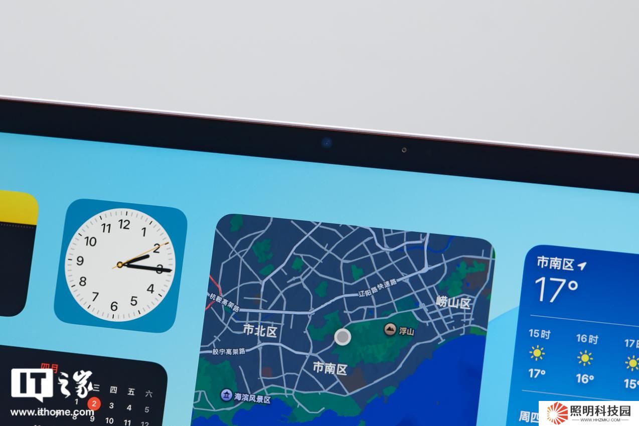 正面亮屏之后,iPad Air 13 英寸這塊大屏幕帶來的視覺沖擊力還是比較足的,屏幕黑邊的寬度相比目前的 iPad Pro 也差不多,前置攝像頭以及光線傳感器在屏幕的右側,沒有面容識別。