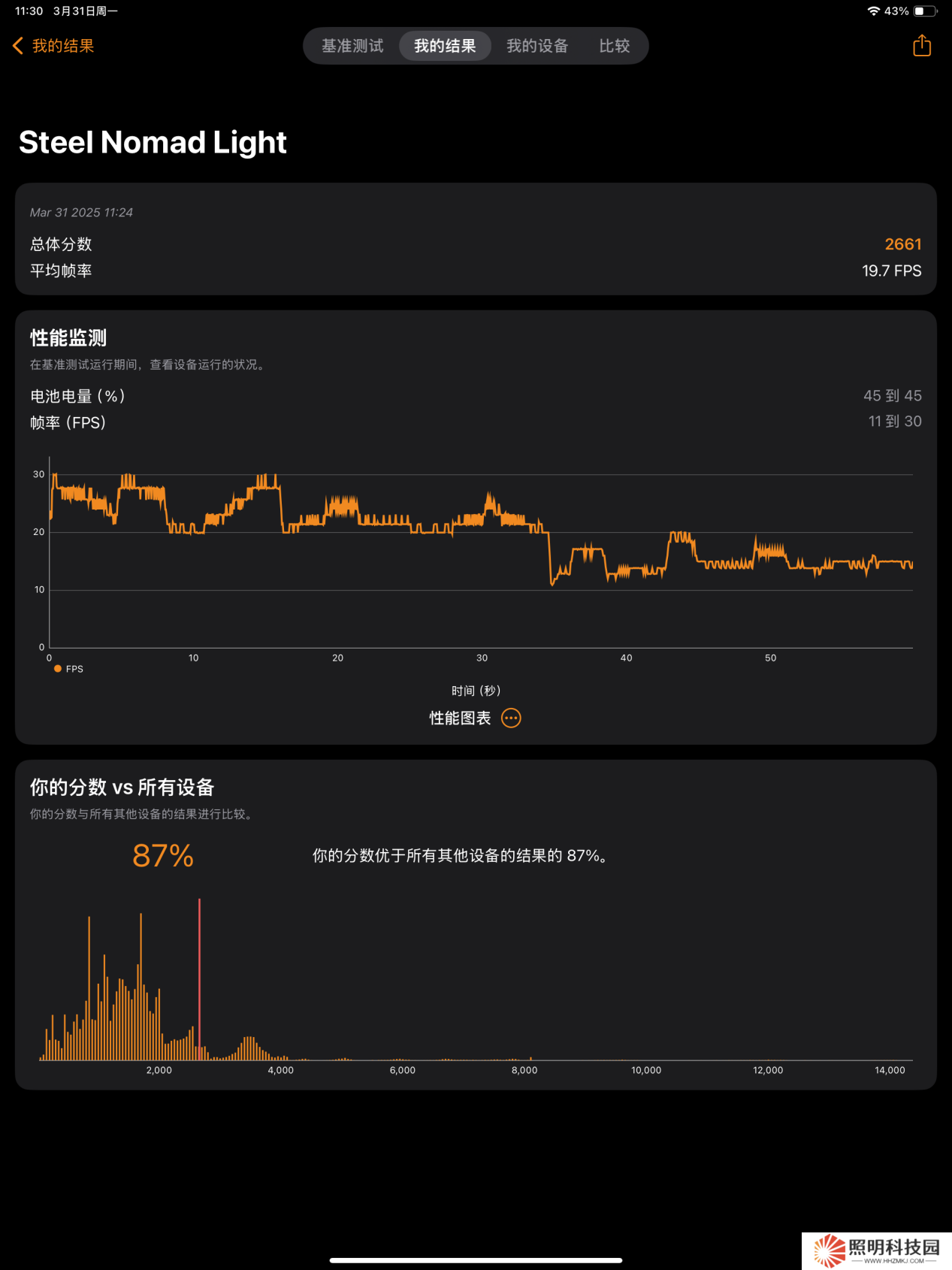 GPU 方面,本站還用《3D Mark》的 Steel Nomad Light 項目進行了測試,iPad Air 2025 總體分數為 2661 分,平均幀率 19.7 FPS。