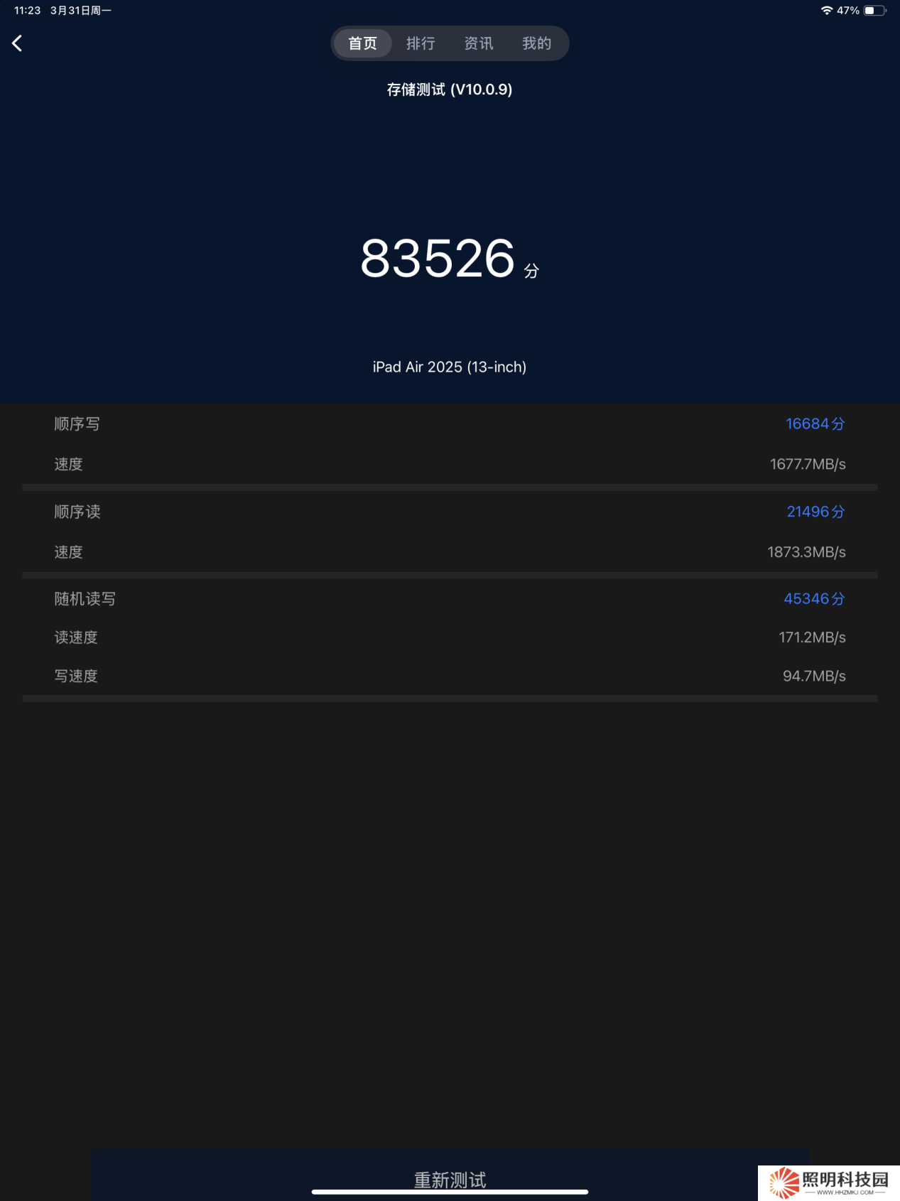 最后,本站又使用《安兔兔評測》對 iPad AIr 進行了存儲性能的測試,測得其順序寫速度為 1677.7MB/s,順序讀速度為 1873.3MB/s,隨機讀速度為 171.2MB/s,隨機寫入速度為 94.7MB/s。