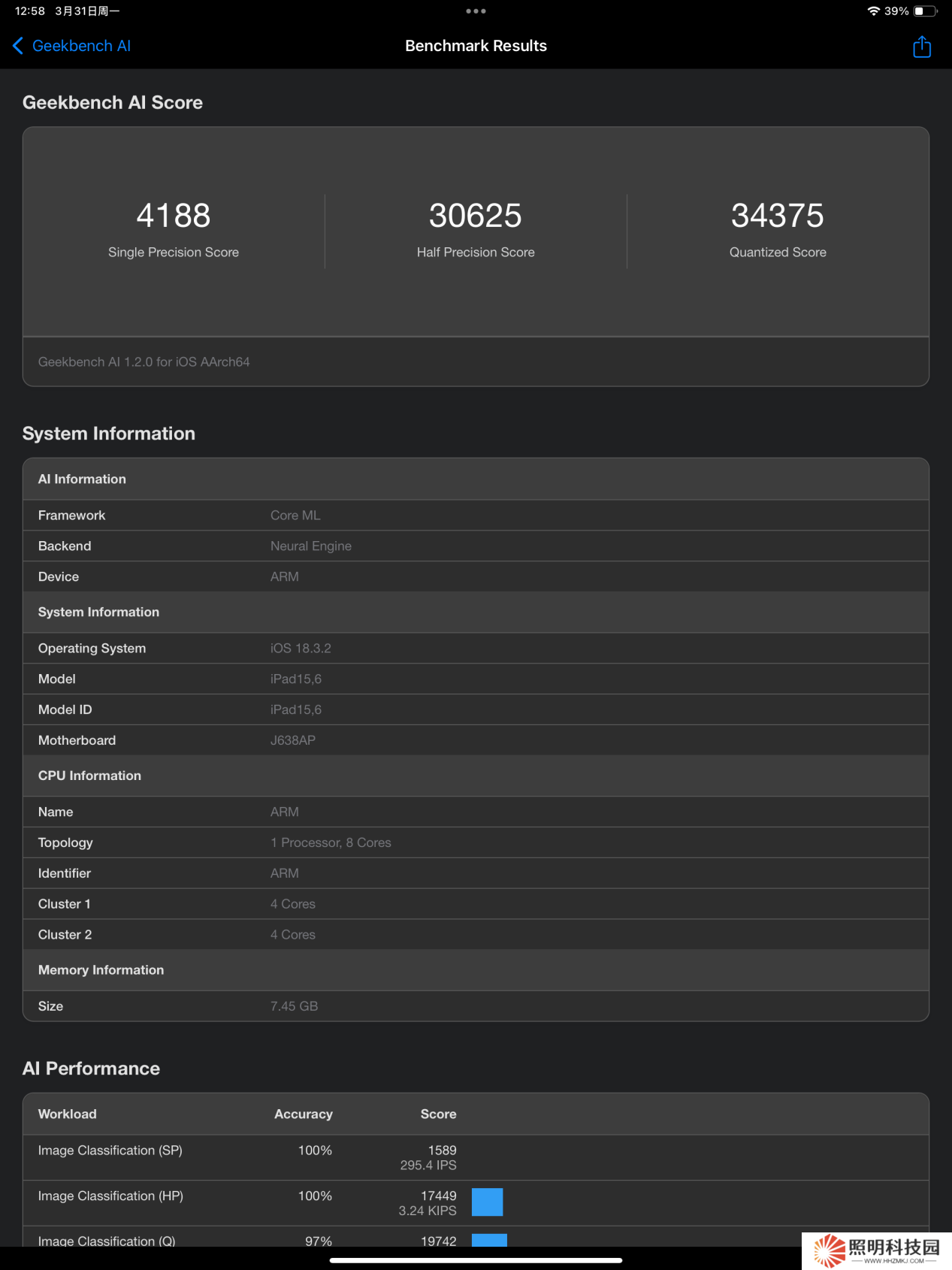 接著,本站還使用《GeekBench AI》對 iPad Air 2025 進行了神經網絡引擎的項目測試,Single Precision Score 得分為 4188 分,Half Precision Score 得分為 30625 分,Ouantized Score 則來到了 34375 分。