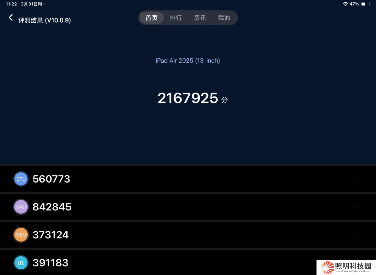 在評測體驗過程中,本站對全新 iPad Air 進行了跑分測試。首先是《安兔兔評測》V10.0.9 的跑分,iPad Air 2025 得到 2167925 分的成績,整體表現十分出色,其中 CPU 得分 560773 分,GPU 成績 842845 分,內存成績 373124 分。