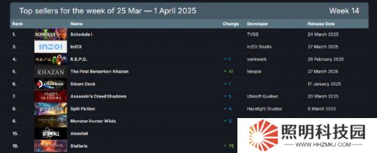 韓國模擬人生游戲《inZOI》排名第二、類魂游戲《第一狂戰士:卡贊》位居第三。育碧開放世界大作《刺客信條:影》未能延續迅猛勢頭位居第六。另有兩款新游《原子隕落》和《Stellaris》,壓哨進場首次登上了Steam周銷榜前十。