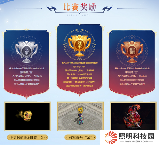 官方為本屆名人爭霸賽豪擲千萬元寶,打造了極為豐厚的獎池。普通賽區冠軍戰隊每人獲得10000元現金獎勵+神威助力獎金,經典賽區冠軍戰隊每人獲得8000元現金獎勵+神威助力獎金,另外兩大賽區冠軍戰隊還將獲得冠軍稱號“帝”、王者風范流光(足跡)、王者隊標、每人獲得2000000銀元寶獎勵、第十五屆名人爭霸賽冠軍獎牌、冠軍時裝:王者風范鎏金(不可染色)、高端限量定制手辦:烽火燃金戈。行走中洲時,盡顯榮耀本色。