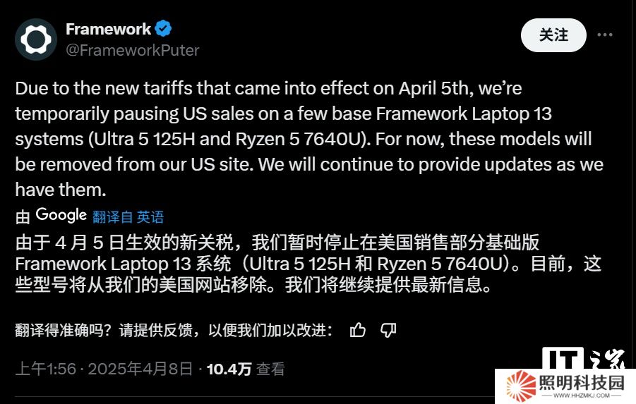 本站 4 月 8 日消息,美國電腦制造商 Framework 宣布,由于特朗普**于 4 月 5 日生效的關稅政策,將“暫時暫停”在美國銷售部分筆記本電腦。