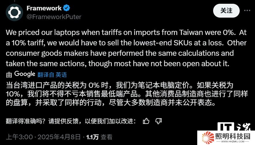 本站注意到,Framework 在另一篇帖子中解釋稱:“我們在為筆記本電腦定價時,臺灣地區進口商品的關稅稅率為 0%。在 10% 的關稅下,我們銷售最低端的型號將面臨虧損。”