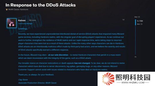 近日暴雪副制作總監Clay Stone在官方論壇的公告中表示,暴雪未來“可能會自行決定復活在我們認為與游戲完整性不符的大規模事件(例如DDoS攻擊)中死亡的專家級角色”。這對此前不得不忍受痛苦的專家模式玩家來說是個好消息,即使他們的角色因為DDoS之類的原因不公平或無意地死亡。