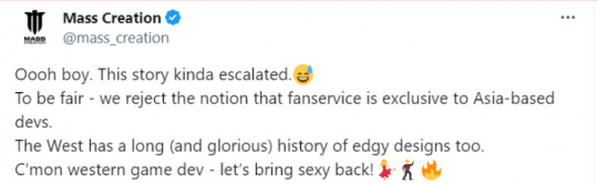 對此,開發團隊Mass Creation進行了澄清。他們表示自己是家波蘭的工作室,西方開發團隊也有悠久的“前沿設計”(擦邊)歷史,這絕非亞洲工作室的專屬。未來,他們將會把“性感”帶回來。