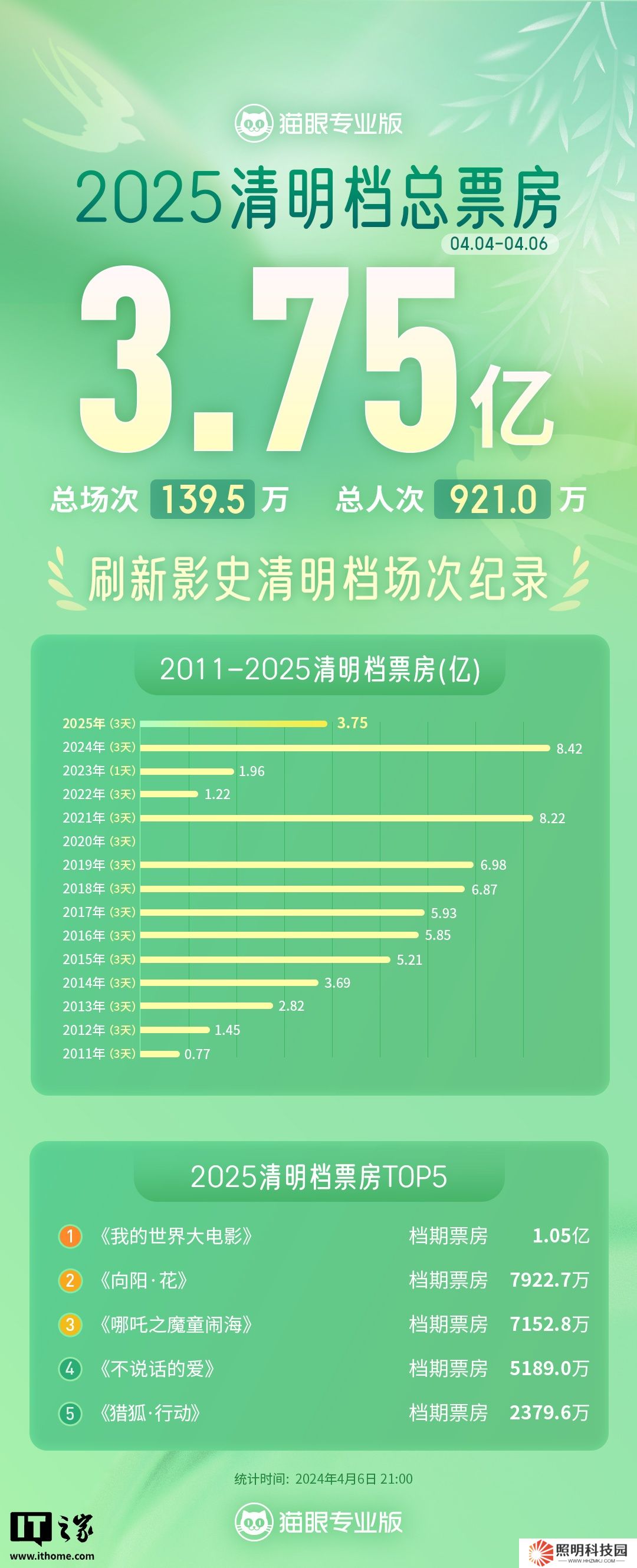 本站 4 月 6 日消息,據(jù)貓眼專業(yè)版數(shù)據(jù),2025 年 4 月 6 日 17 時 20 分,2025 年清明檔新片總票房破 3 億,《我的世界大電影》暫列第一,《向陽?花》和《不說話的愛》分列二三位。