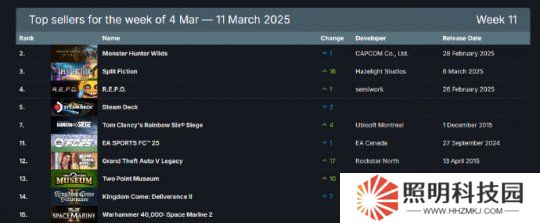 Steam DB日前統計了2025年第11周Steam周銷榜的數據,卡普空推出的動作游戲《怪物獵人:荒野》熱度不減,實現了三連冠。本期榜單新作相對較少,普遍還是以打折的老游戲為主。