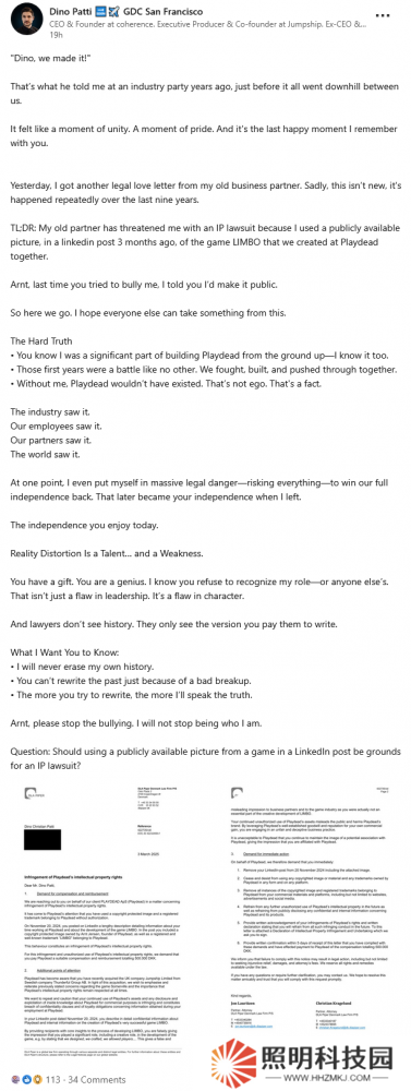 據 Patti 目前稱,Jensen 在過去 9 年里“多次”威脅要對他采取“法律行動”。他之所以現在公開這些事情,是因為“上次(Arnt)試圖欺壓我時,我告訴(他)我會曝光此事。”Patti 還表示,他本人是“從零創立 Playdead 的重要部分……沒有我,Playdead 就不會存在。這并非自大。這是事實。”