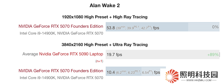 《賽博朋克 2077》:5090 移動版平均為 52.2 幀,5070 桌面版為 47.4 幀,5090 移動版領(lǐng)先 10%