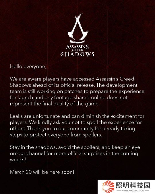 之前我們報道過《刺客信條:影》已遭偷跑,甚至包含實體版,網上也出現相關視頻和信息。近日育碧發聲明回應了游戲偷跑事件,他們感到非常遺憾,并希望玩到的人不要劇透。