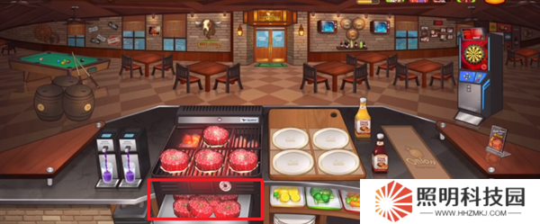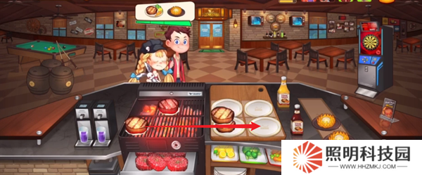 1、玩家們進入關卡之后,將會需要點擊下方的牛排開始進行明火烤制,于此同時布置飲料以及餐盤。