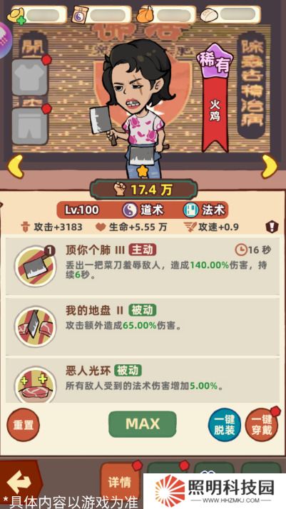 火雞的主動技能可以使普通攻擊變成旋轉菜刀,對范圍內的敵人造成傷害。被動技能可以增加自己的傷害,并且可以使敵人受到的法術傷害提高,來增加整個隊伍的傷害。火雞是推進主線就可以獲得的角色,并且有著不俗的范圍輸出能力,大俠可以在前期著重進行培養哦~
