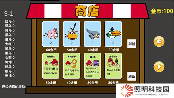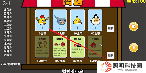 3、在商店當中你將能夠使用金幣來購買各種小鳥或者增益。