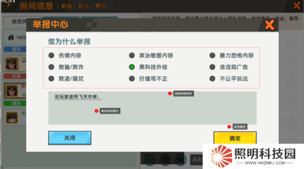 3、舉報類型選擇“黑科技**”,下方輸入框內填寫上該玩家具體的作弊內容,然后點擊【確定】就可以了。