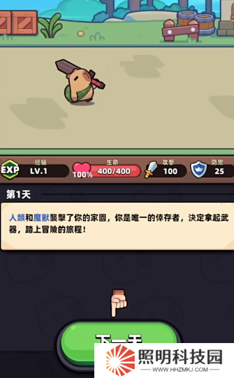 1、玩家們進入游戲之后,將能夠操控自己的小卡皮巴拉開始進行冒險,點擊下一天就能夠進行推進。