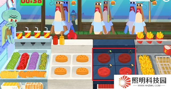 3、當(dāng)出現(xiàn)客人之后,就能夠開始煎肉餅,并由此進(jìn)行美味蟹皇堡的制作了。