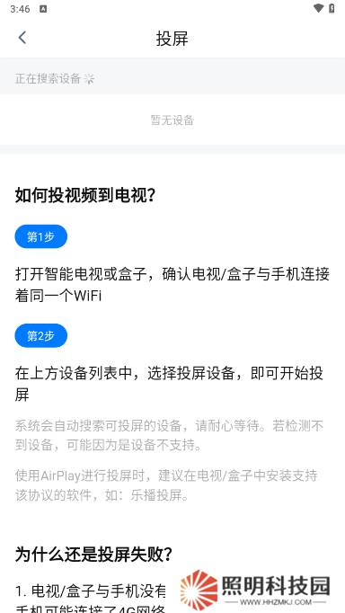 為什么還是投屏失敗?1.電視/盒子與手機沒有連接在同一個WiFI,或者手機可能連接了4G網絡。