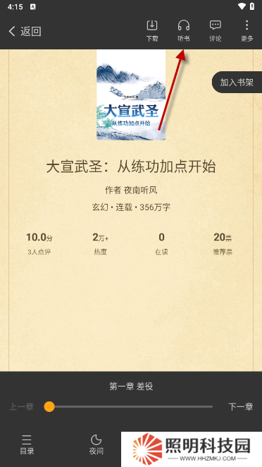 1、選擇你喜歡的小說閱讀,然后點擊上面的聽書菜單就可以聽書了