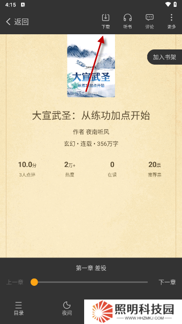 1、選擇你喜歡的小說閱讀,然后點擊閱讀菜單,就可以看到下載按鈕了