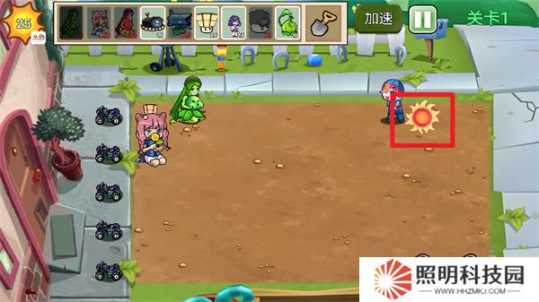5、進(jìn)入到場景內(nèi)后,玩家們需要收集場景內(nèi)掉落的陽光購買植物進(jìn)行種植。