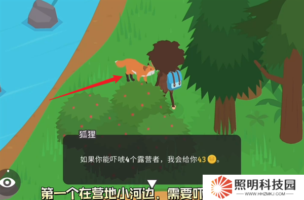 1、玩家們首先需要操控自己的大腳怪來(lái)到河邊,并與狐貍之間進(jìn)行對(duì)話,就能夠接取到一個(gè)嚇唬露營(yíng)者的任務(wù)。