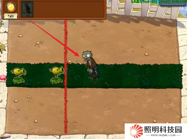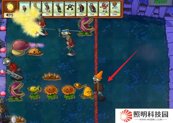 3、等到二路的僵尸破壞向日葵之后,拾取陽光,并在五路放置兩個路障僵尸。