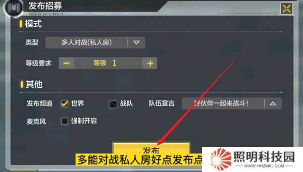 4、就會彈出一個發布招募的模式選擇界面,這個時候只要在模式類型里面選擇【多人對戰(私人房)】就行。