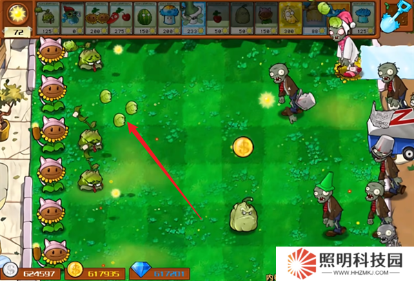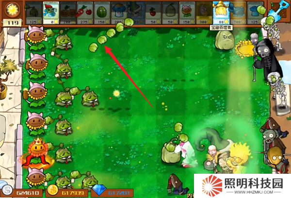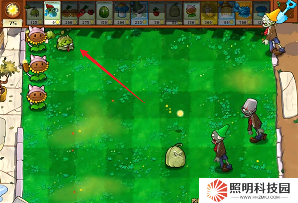 1、玩家們首先需要在場景當中種植內卷投手,他會周期性的投擲卷心菜來攻擊僵尸。