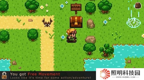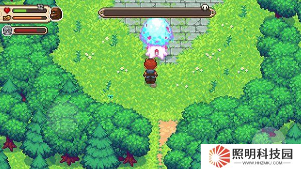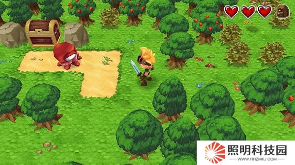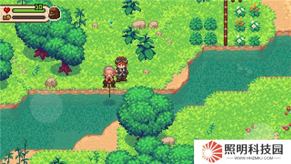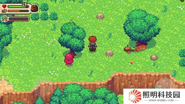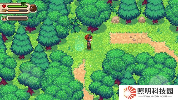 在沒有武器的情況下路上的灌木叢會擋住你的去路,有武器時只需點擊攻擊鍵就可以擊毀灌木叢,在擊毀灌木叢后有幾率掉落補血的紅心和金幣,屏幕左上角綠色條是生命值,底下的黃色條是經驗值,擊殺怪物后獲得大量經驗值升級,在森林中如果遇到寶箱一定要面對寶箱點擊攻擊鍵打開寶箱,可能會獲得物品。