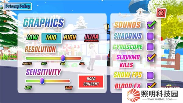 2、啟動游戲后,通過點擊屏幕右下角的“設(shè)置”圖標(biāo),對游戲的圖形質(zhì)量、靈敏度、慢動作效果、陰影等選項進(jìn)行調(diào)整。