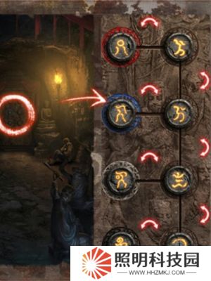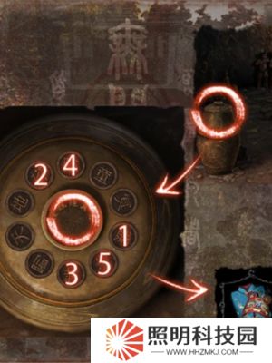 5、接著回到墳場將魚幡掛到大墳墓處,根據(jù)風向可以獲得山洞門上的密碼,密碼順序如下圖所示。
