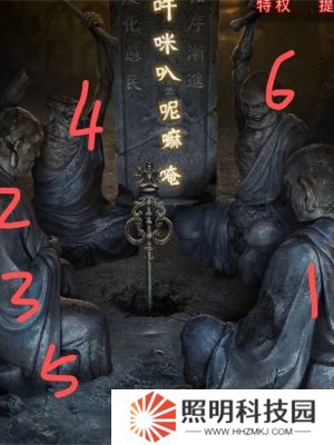 4、點擊山洞的通路在佛像處玩?zhèn)€小游戲,根據(jù)下圖順序點擊就可以獲得道具禪杖,點擊左邊的水池使用禪杖獲得道具魚幡、不倒翁。