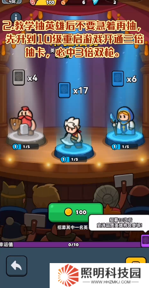 4、教學抽英雄后不要急著抽,,先升到10級重啟游戲開通3倍抽卡,必中3倍雙槍。