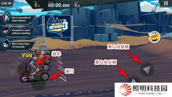 4、駕駛摩托車時,玩家會看到幾個主要的操作按鈕。對于初學者,建議的操作方式是:用左手持續按住油門按鈕,同時用右手點擊控制重心的按鈕,以保持摩托車的平衡,避免摔倒。