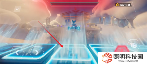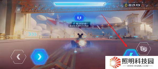 12、玩家們也可以通過右下角的跳躍鍵來(lái)讓自己的卡丁車主動(dòng)的進(jìn)行跳躍,并跨越場(chǎng)景當(dāng)中的障礙。