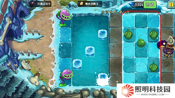 左數第一、二、三列,會出現縱向浮冰,一、三列是從下到上,二列是從上到下。玩家需要踩著浮冰去到對岸,同時也要規避在岸上的食人花。很多人都容易在這里有失誤,導致過關失敗,主要有兩點:浮冰跳躍時機沒有把控好和被大嘴花吃掉。